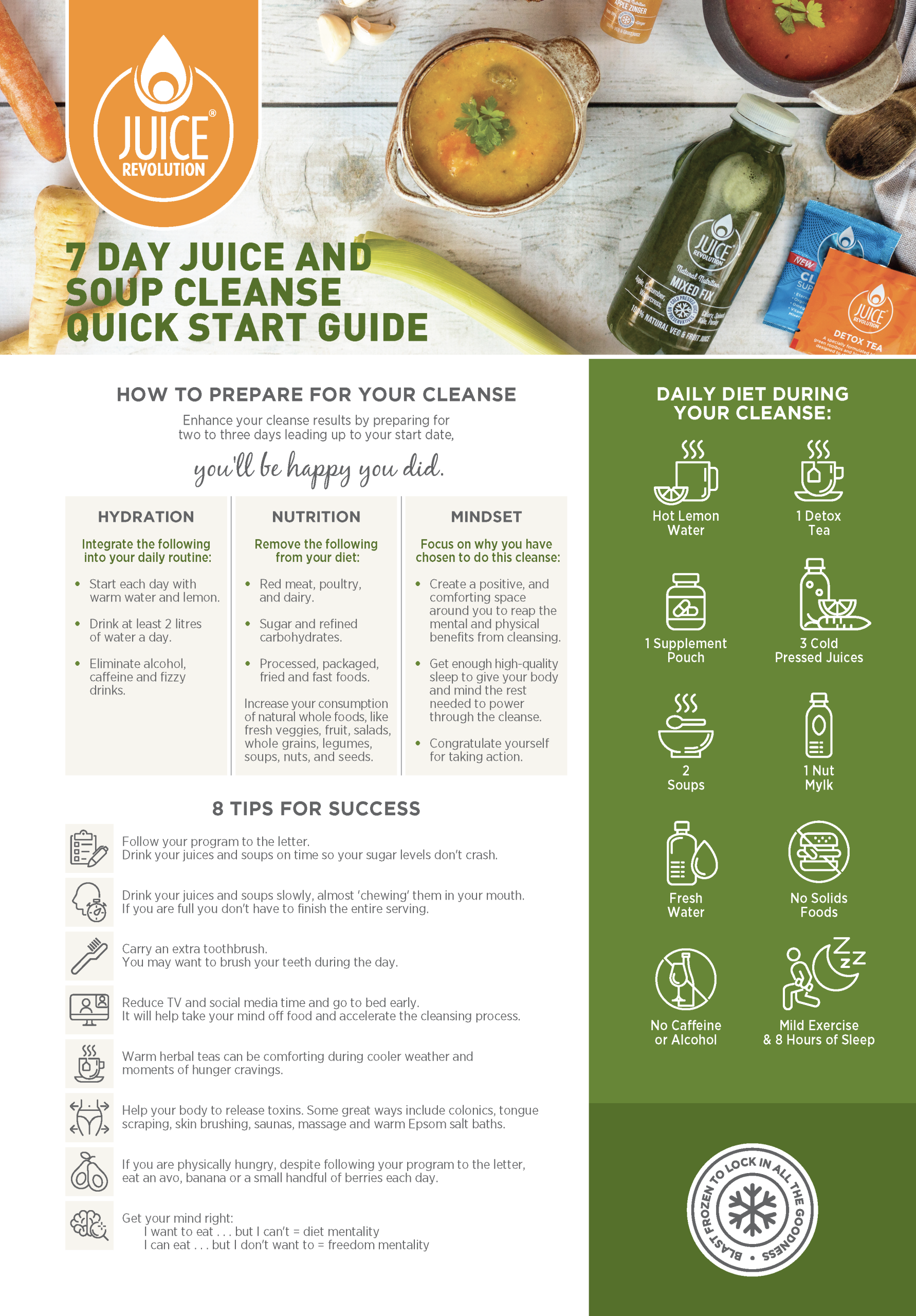 Each cleanse includes everything you need to succeed: herbal teas, targeted supplements, and a high-fibre mix to support gut health and detoxification. A printed Quick Start Guide makes it simple to follow, and our daily coaching messages keep you motivated and accountable. Each bottle comes with motivational lid stickers, so you always know what to have next.