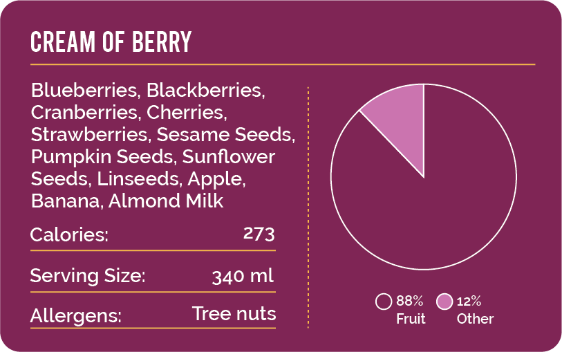 Almond Milk, Apple, Banana, Blackberry, Blueberry, Cherry, Cranberry, Linseeds, Sesame Seeds, Strawberry, Sunflower Seeds